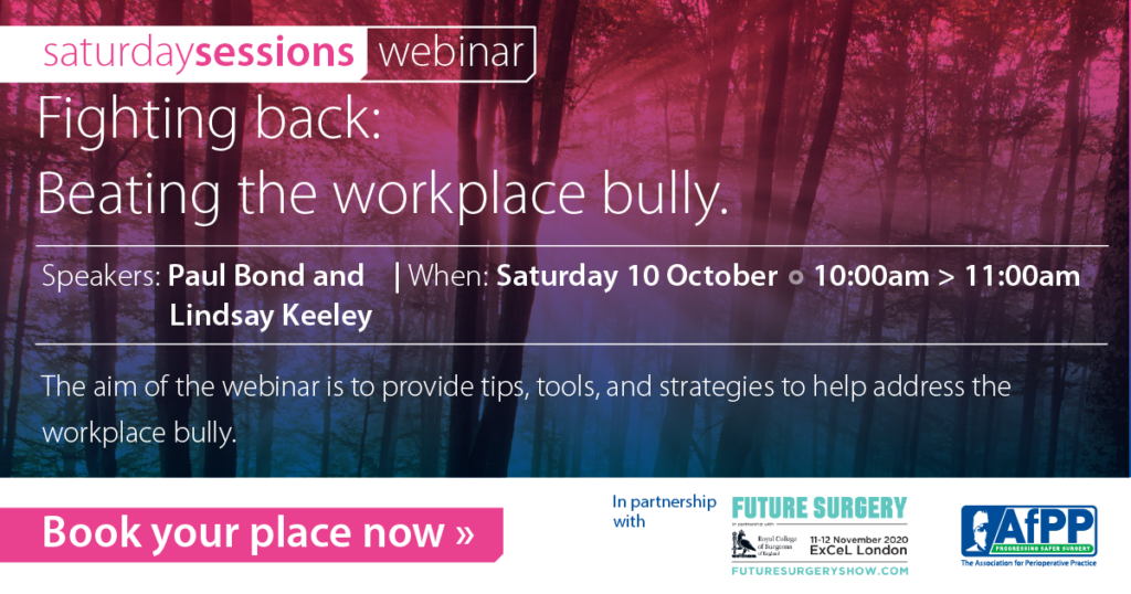 The recent Caring for those who Care survey highlighted that bullying is a significant cause for concern in the perioperative workplace. In this unmissable webinar, Lindsay Keeley and Paul Bond will provide you with tips, tools, and strategies to help address and beat the workplace bully.