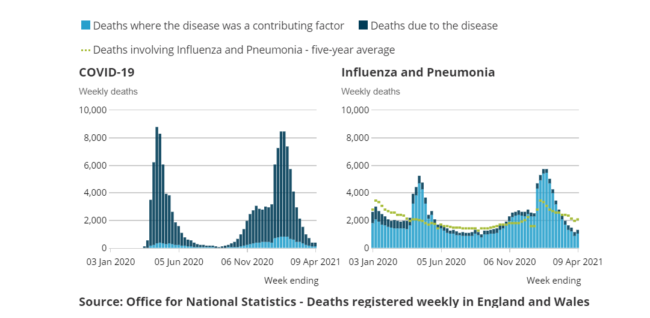 According to the Office of National Statistics on April 23rd 2021, in the week ending 9 April 2021, the number of deaths involving the coronavirus (COVID-19) registered in England and Wales…