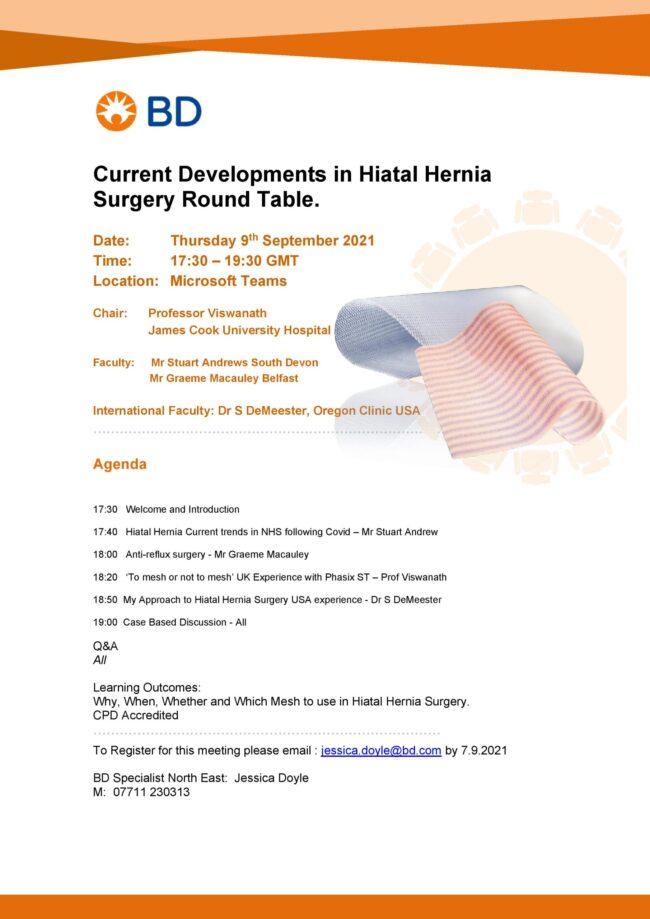 Current Developments in Hiatal Surgery Virtual Round Table – Thursday 9th September at 5:30 -7:30 pm GMT NewsBy ALSGBI AdminAugust 22, 2021Leave a comment