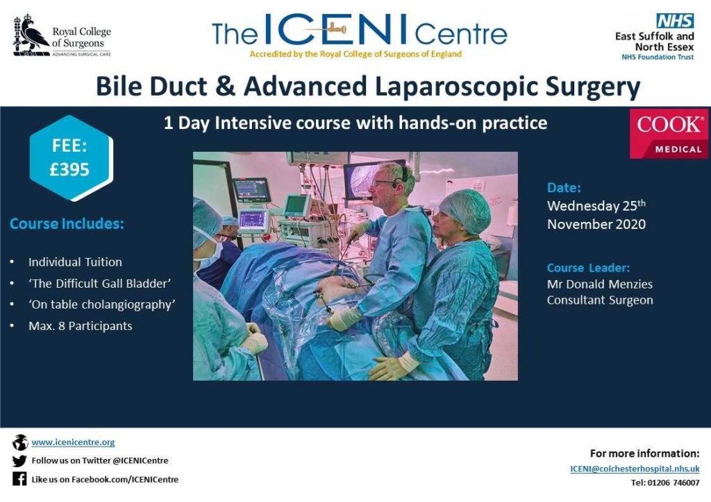 | Course objectives | Advanced procedure–based course highlighting the technical and logistical aspects of one session laparoscopic exploration of the bile duct. The course is designed for consultant surgeons and senior trainees who have mastered the skills of routine and emergency laparoscopic cholecystectomy and may already have experience with intra-operative cholangiography. The candidates are made familiar with the technical aspects through short interactive talks. The course has a major practical hands-on component with opportunity to practice cholangiography, trans-cystic duct cannulation and exploration, choledochotomy exploration and various methods of biliary drainage. There will be emphasis on the handling and optimal use of 3mm & 5mm choledochoscopes. Well designed animal tissue models allow for task repetition and skills development and consolidation. Adequate time is dedicated to detailed discussions of technical aspects utilising extensive video material from more than 800 Laparoscopic bile duct explorations. ISCP curriculum considers bile duct exploration a mandatory procedure and the technical skills required for ST6 (level 3) to ST8 (level 4) |