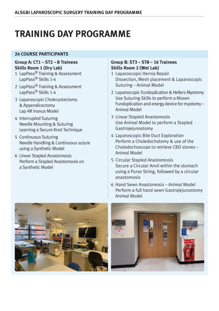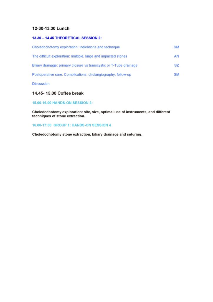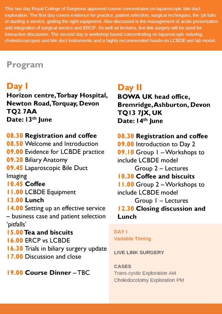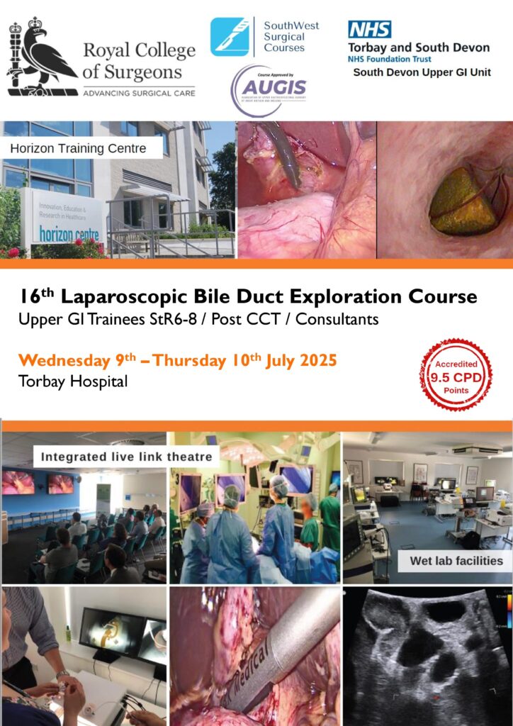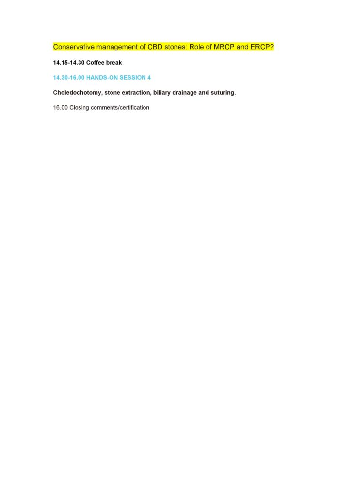 | Target delegates | Maximum 8 participants. Consultant surgeons and senior trainees who have mastered the skills of routine and emergency laparoscopic cholecystectomy and may already have experience with intra-operative cholangiography or bile duct exploration |