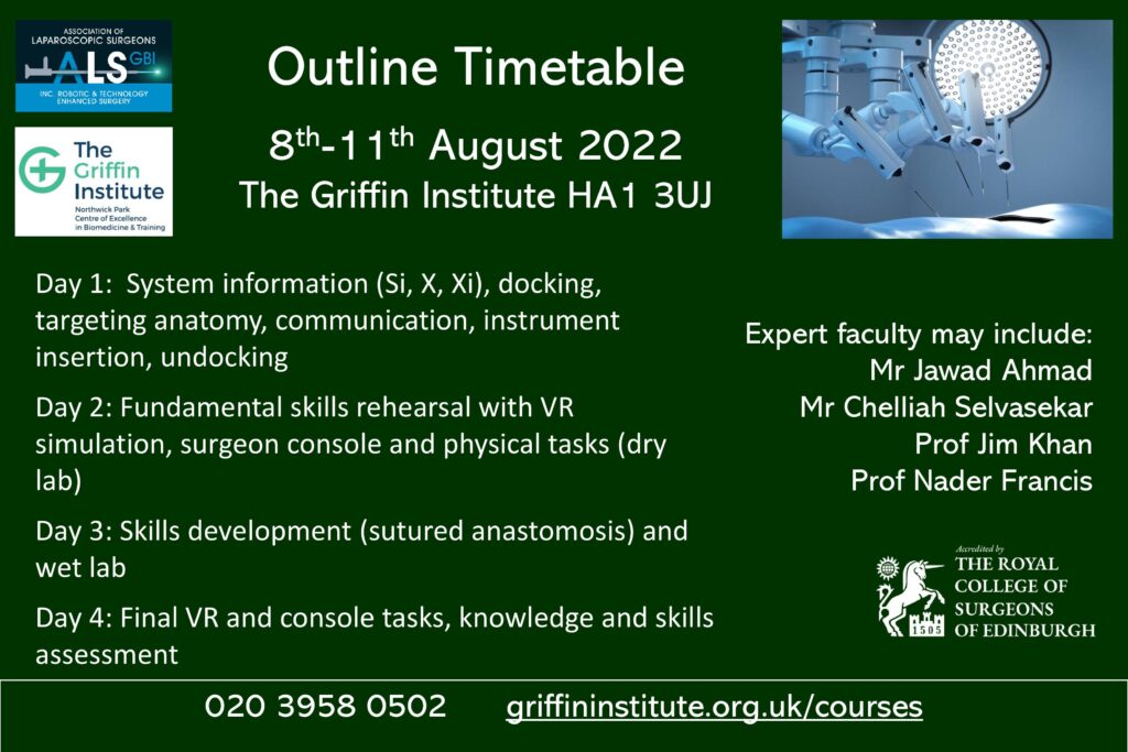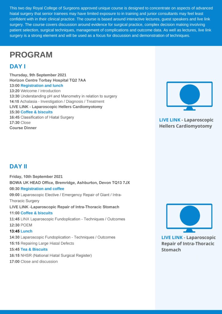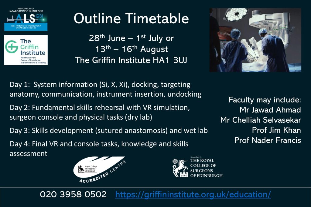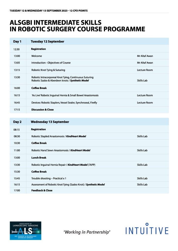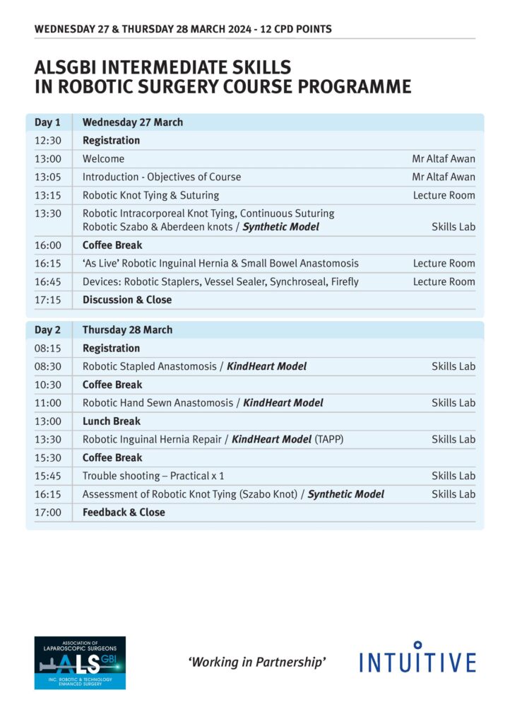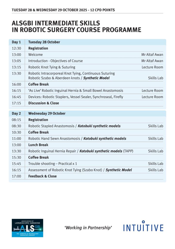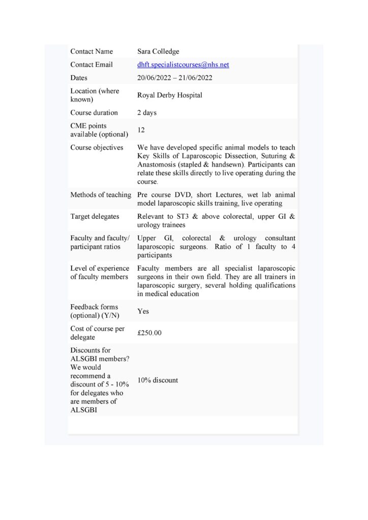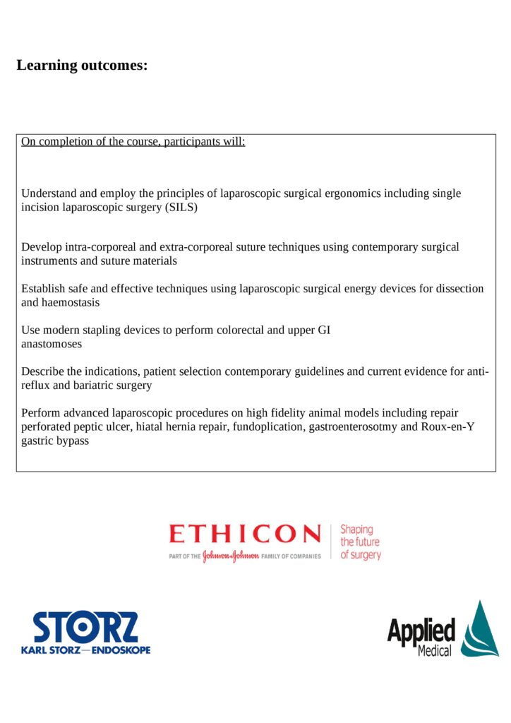 | Course objectives | We have developed specific animal models to teach Key Skills of Laparoscopic Dissection, Suturing & Anastomosis (stapled & handsewn). Participants can relate these skills directly to live operating during the course. |