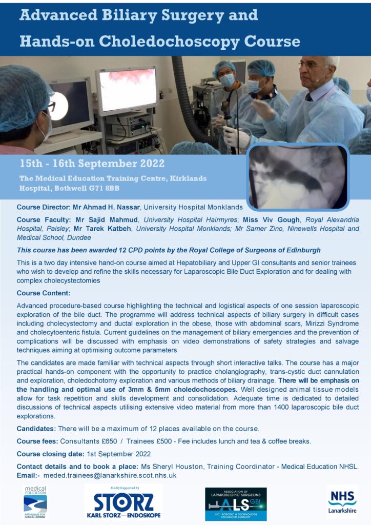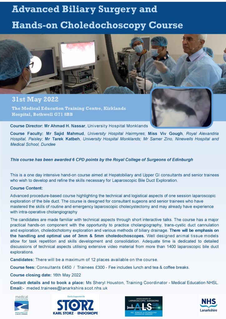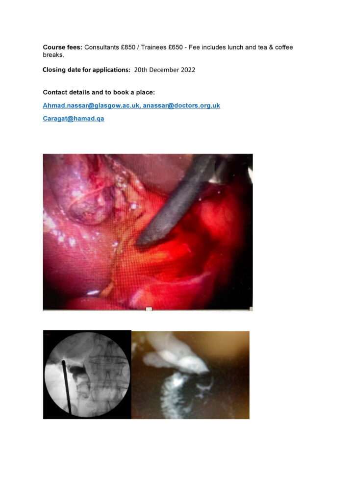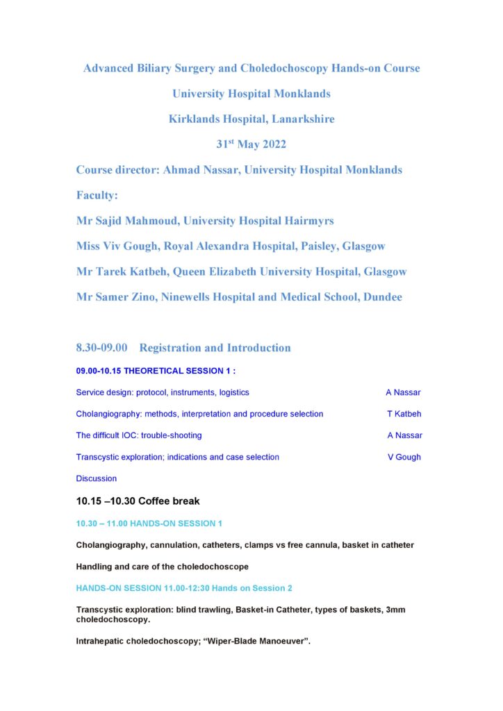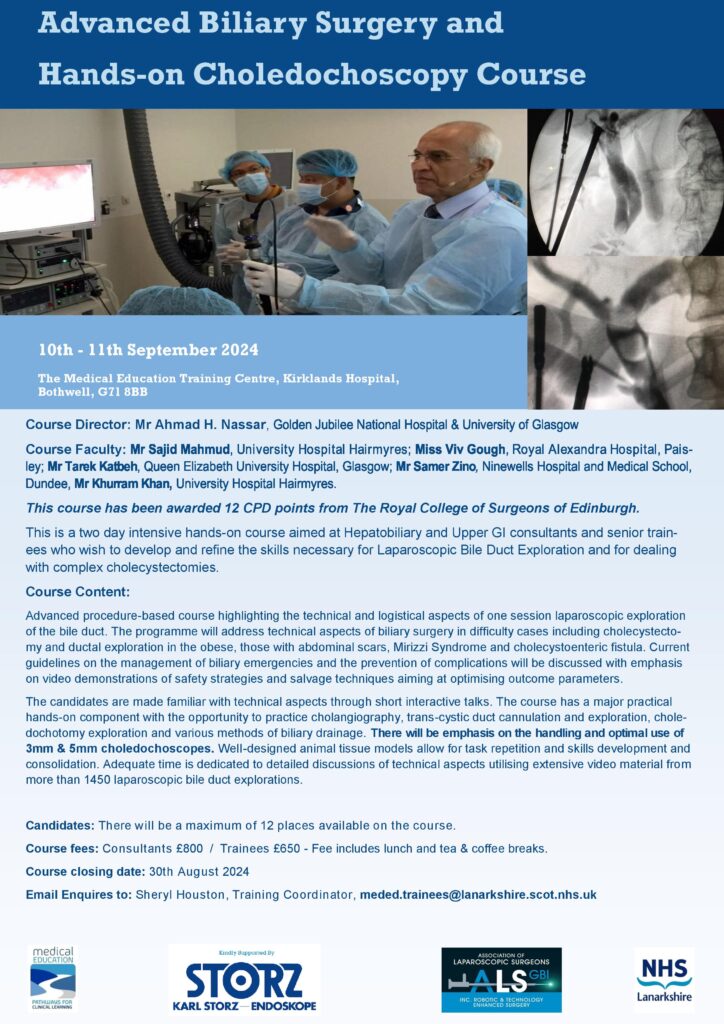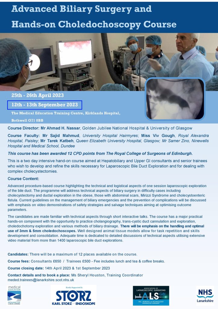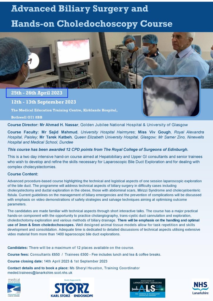 | Level of experience of faculty members | A Nassar, 20 years experience in bile duct exploration, Director of laparoscopic and bile duct courses for EAES, choledochoscopy courses at EHPBA,IHPBA congresses and various international society meetings. Former Vice Chairman of the EAES Education and Training Committee and faculty at Cuschieri skills Centre courses, MATTU, MATTUS S Mahmud. wide experience of laparoscopic biliary and upper GI. A special interest in bile duct exploration H Qandeel, experience in laparoscopic surgery and bile duct exploration as well as conducting advanced laparoscopic courses at the METC, Lanarkshire |