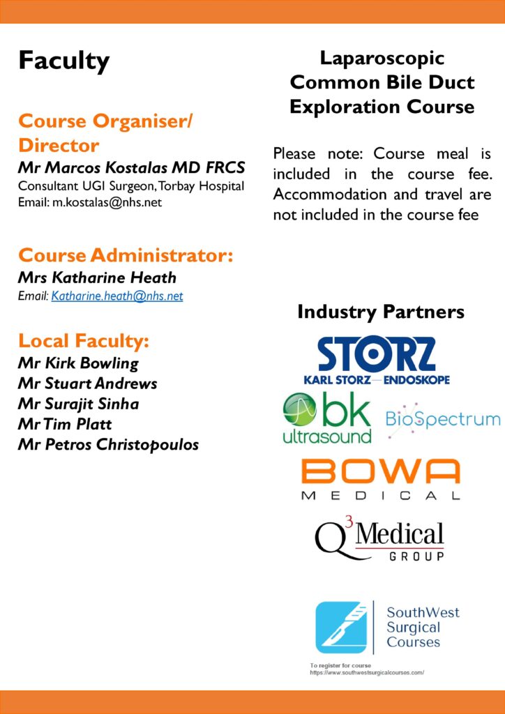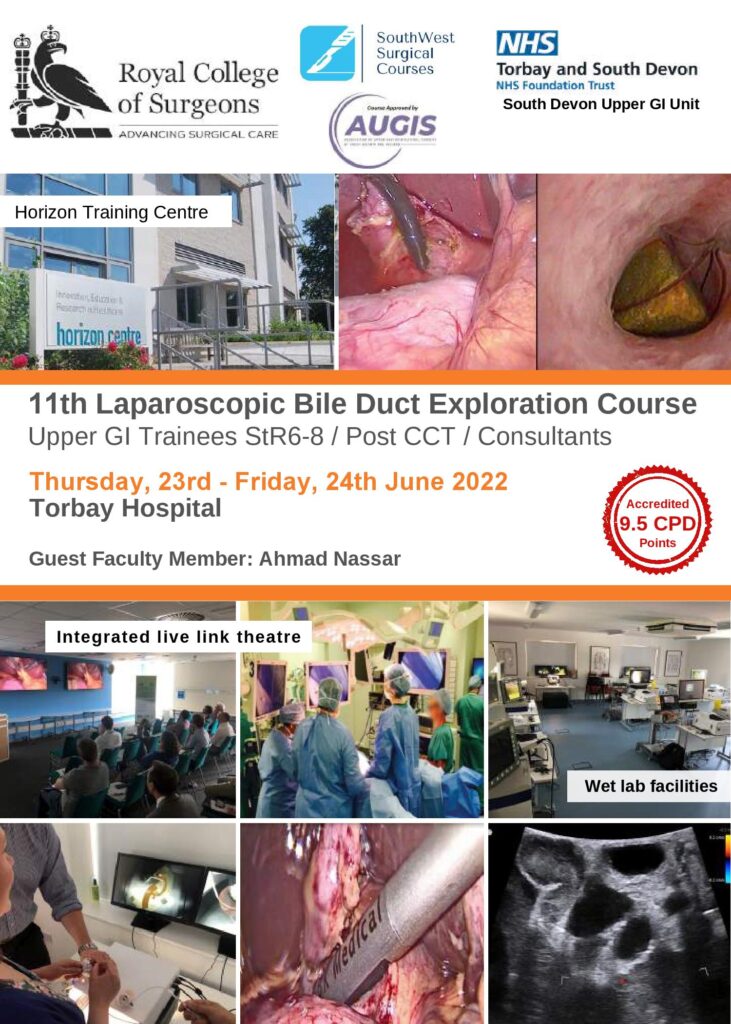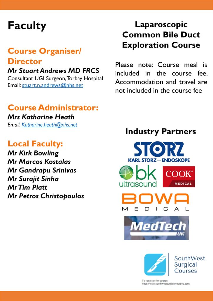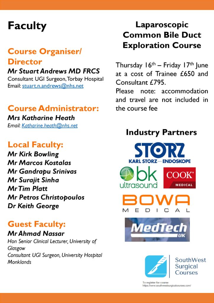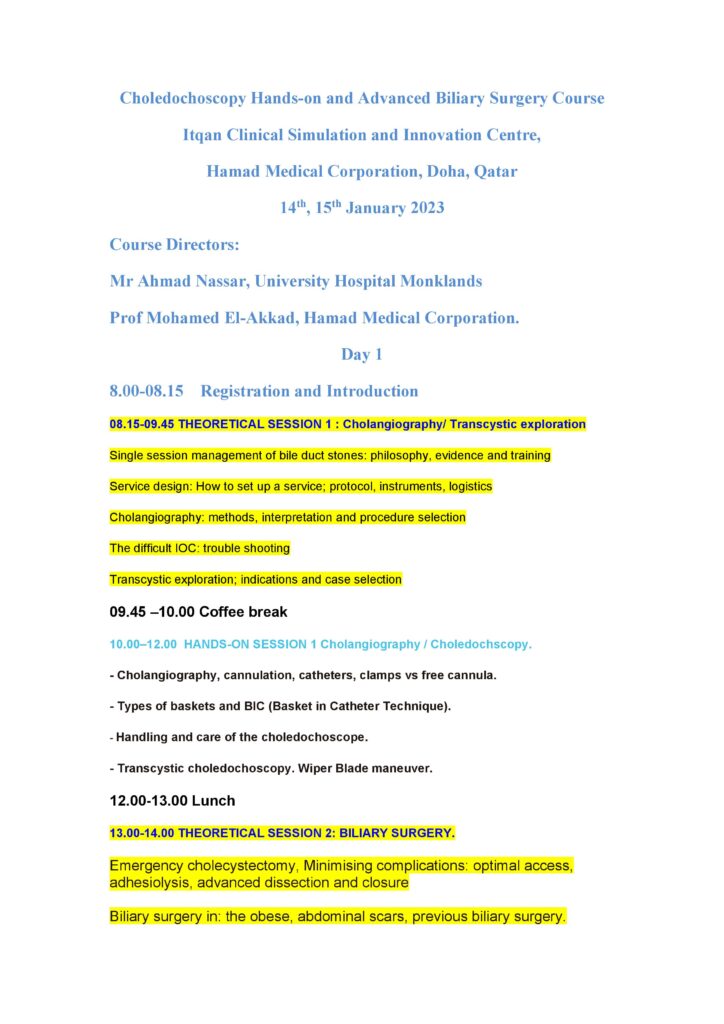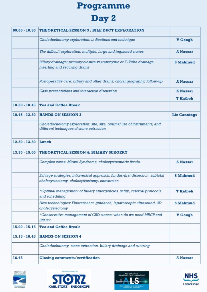 | Level of experience of faculty members | A Nassar, 20 years experience in bile duct exploration, Director of laparoscopic and bile duct courses for EAES, choledochoscopy courses at EHPBA,IHPBA congresses and various international society meetings. Former Vice Chairman of the EAES Education and Training Committee and faculty at Cuschieri skills Centre courses, MATTU, MATTUS S Mahmud. wide experience of laparoscopic biliary and upper GI. A special interest in bile duct exploration H Qandeel, experience in laparoscopic surgery and bile duct exploration as well as conducting advanced laparoscopic courses at the METC, Lanarkshire |