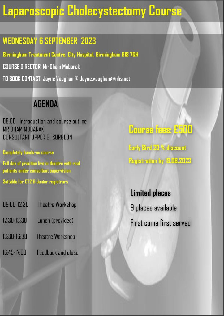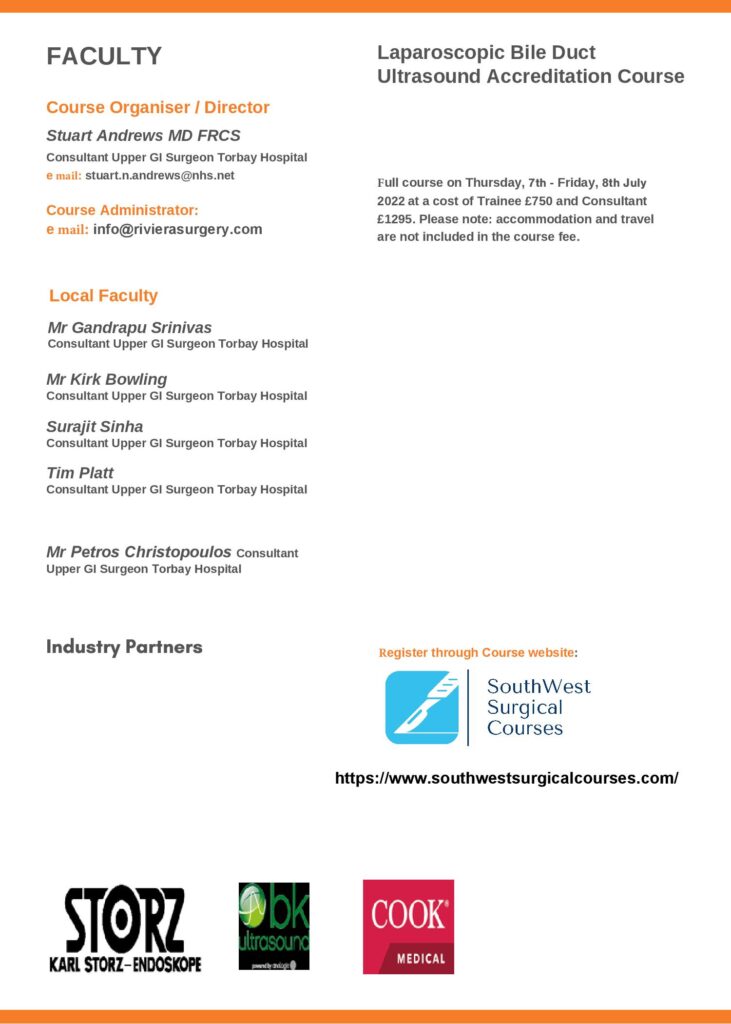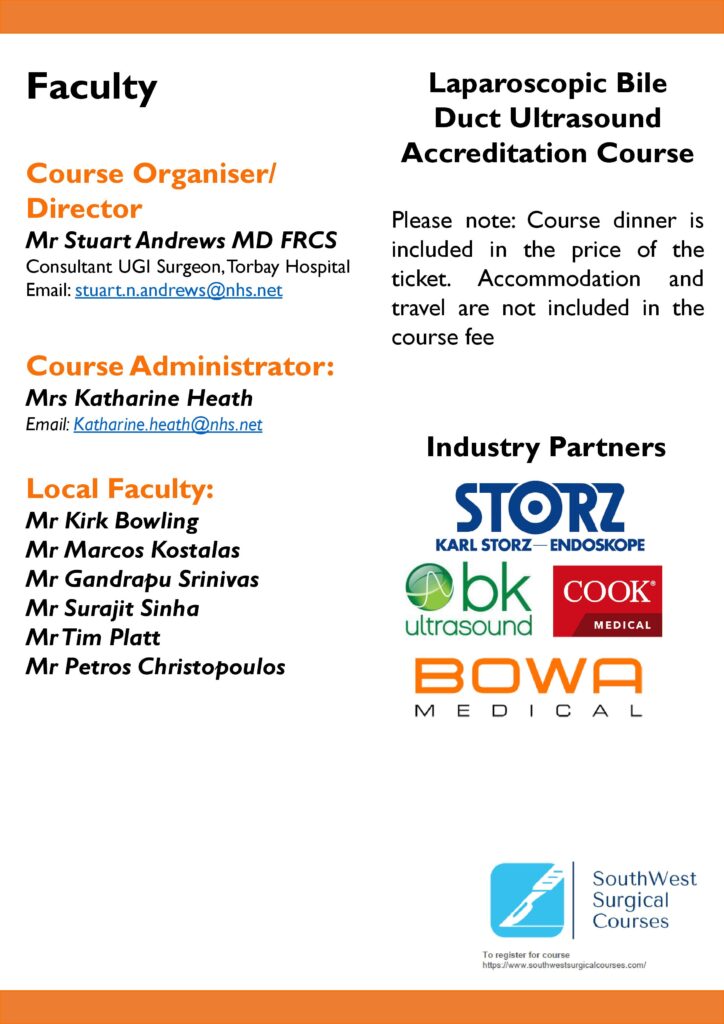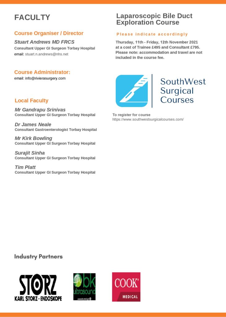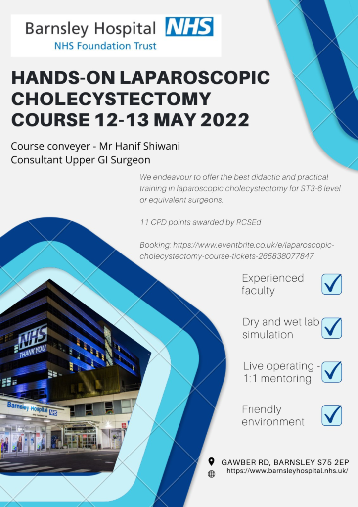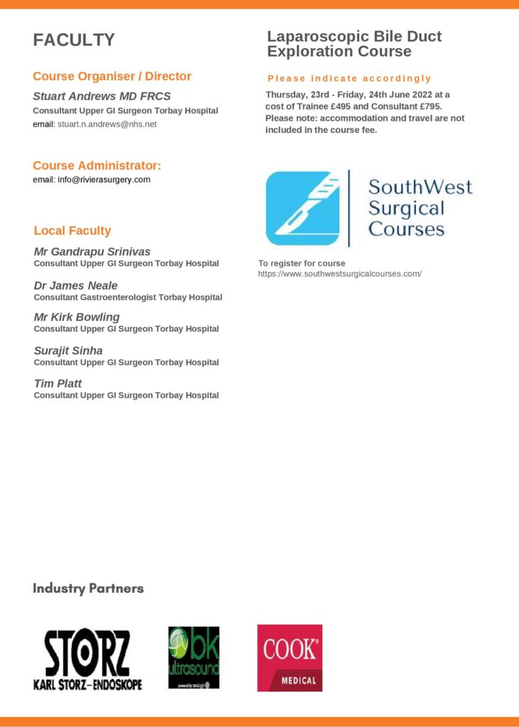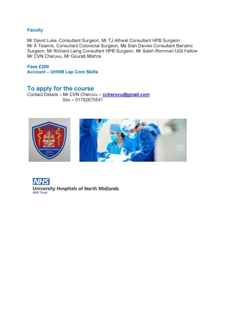 | Level of experience of faculty members | A Nassar, 20 years experience in bile duct exploration, Director of laparoscopic and bile duct courses for EAES, choledochoscopy courses at EHPBA,IHPBA congresses and various international society meetings. Former Vice Chairman of the EAES Education and Training Committee and faculty at Cuschieri skills Centre courses, MATTU, MATTUS S Mahmud. wide experience of laparoscopic biliary and upper GI. A special interest in bile duct exploration H Qandeel, experience in laparoscopic surgery and bile duct exploration as well as conducting advanced laparoscopic courses at the METC, Lanarkshire |