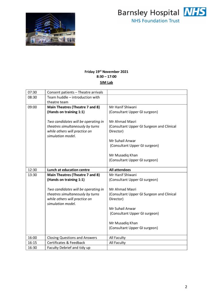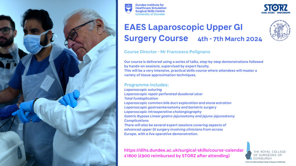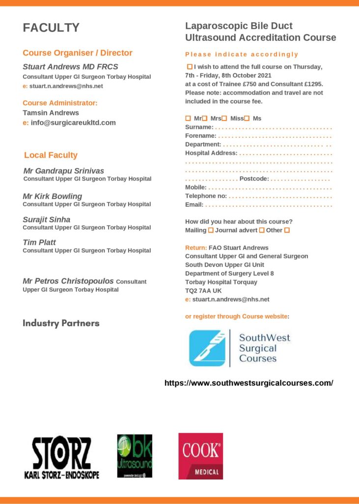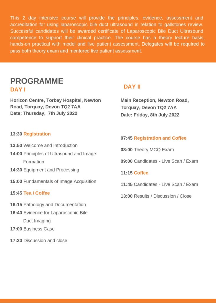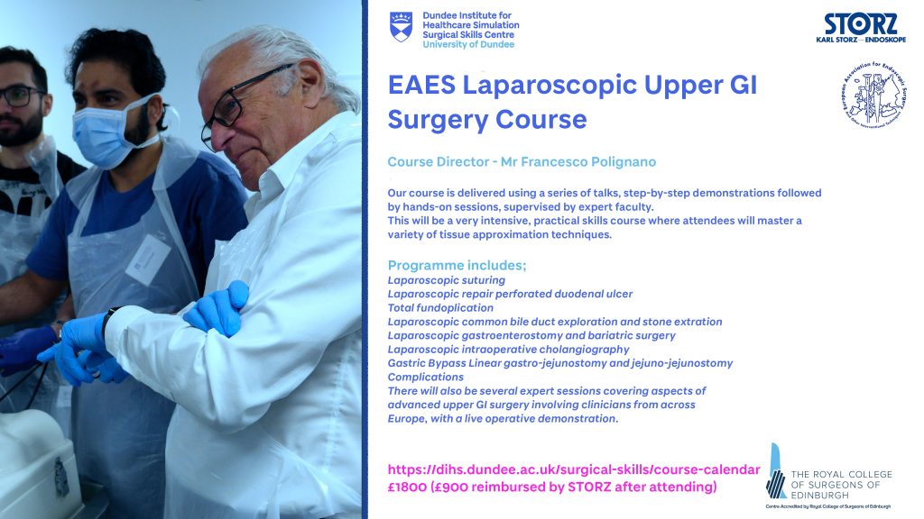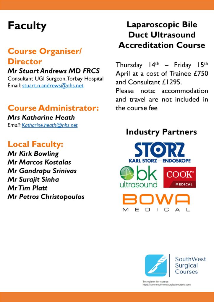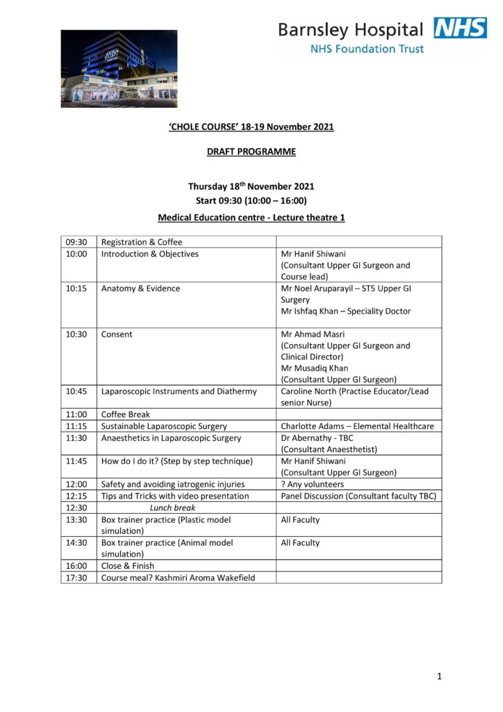 | Level of experience of faculty members | A Nassar, 20 years experience in bile duct exploration, Director of laparoscopic and bile duct courses for EAES, choledochoscopy courses at EHPBA,IHPBA congresses and various international society meetings. Former Vice Chairman of the EAES Education and Training Committee and faculty at Cuschieri skills Centre courses, MATTU, MATTUS S Mahmud. wide experience of laparoscopic biliary and upper GI. A special interest in bile duct exploration H Qandeel, experience in laparoscopic surgery and bile duct exploration as well as conducting advanced laparoscopic courses at the METC, Lanarkshire |