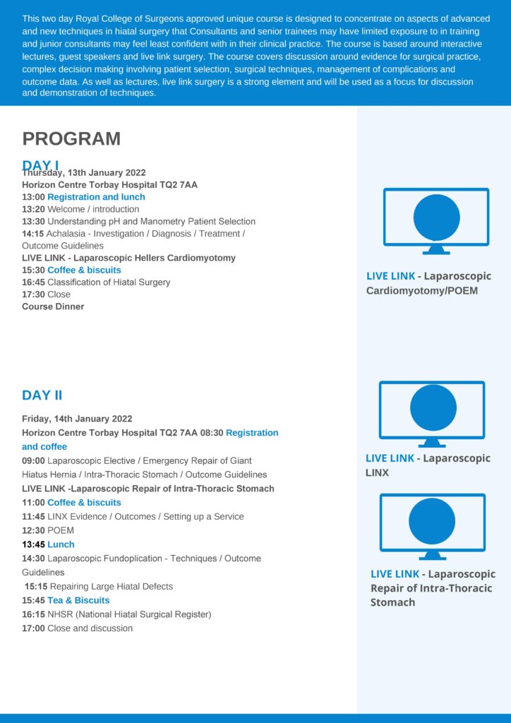 | Course objectives | This course is designed for higher surgical trainees to gain a greater knowledge and understanding of safe Laparoscopic Cholecystectomy Surgery. The participants are made familiar with technical aspects of the safe procedure through the short talks and plastic, animal model dissection as well as simulation. It will also provide practical hands on experience for each candidate |