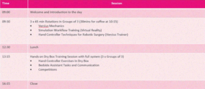 Day 2: Fundamental skills rehearsal with VR simulation, surgeon console and physical tasks (dry lab)