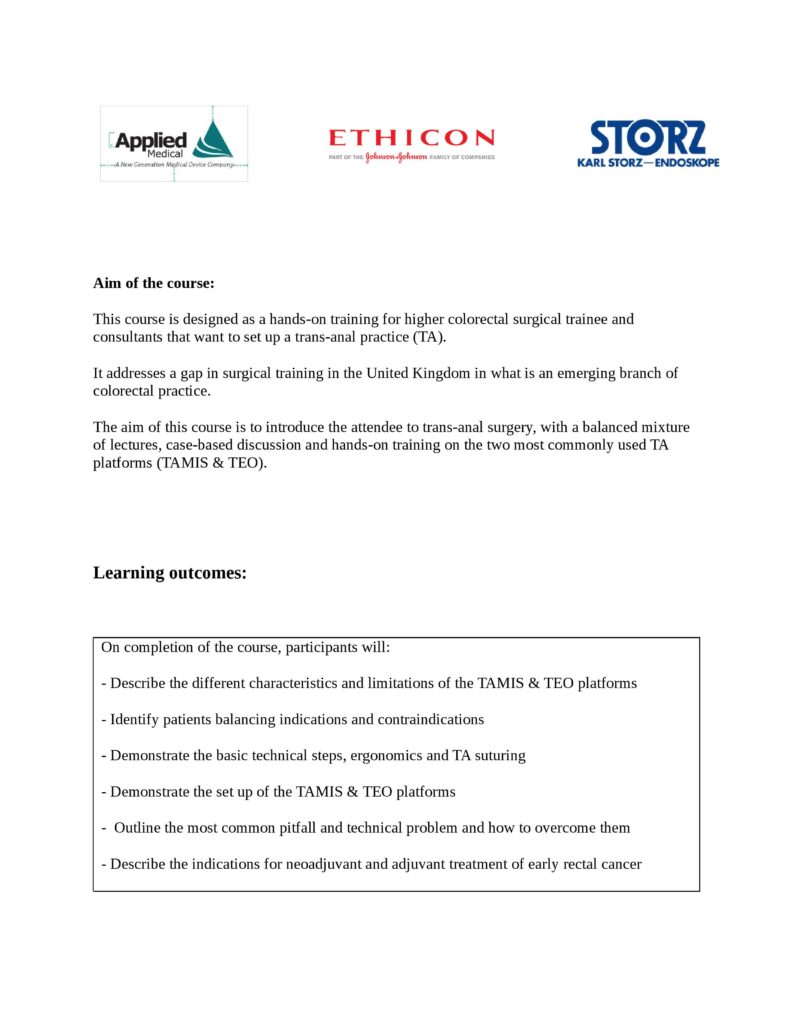 | Course objectives | Practical hands on curse aimend at providing delegates with technical skills to perform single incision laparoscopic colorectal surgery |