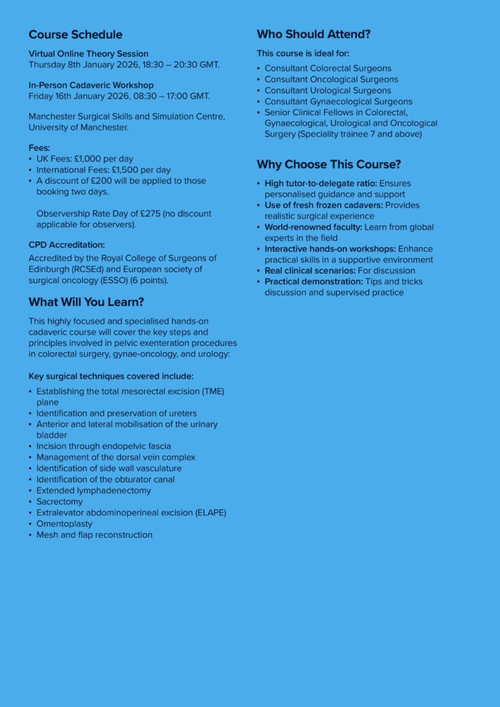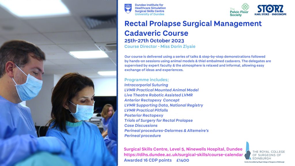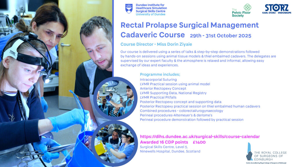 The Rectal Prolapse Surgical Management Cadaveric Course is designed for hands-on practice on Thiel-embalmed cadavers. This course is suitable for Consultants, Fellows & ST7 – ST8 with an interest in pelvic floor dysfunction. Each session will be preceded by talks and video presentations followed by demonstrations and cadaveric practical sessions.