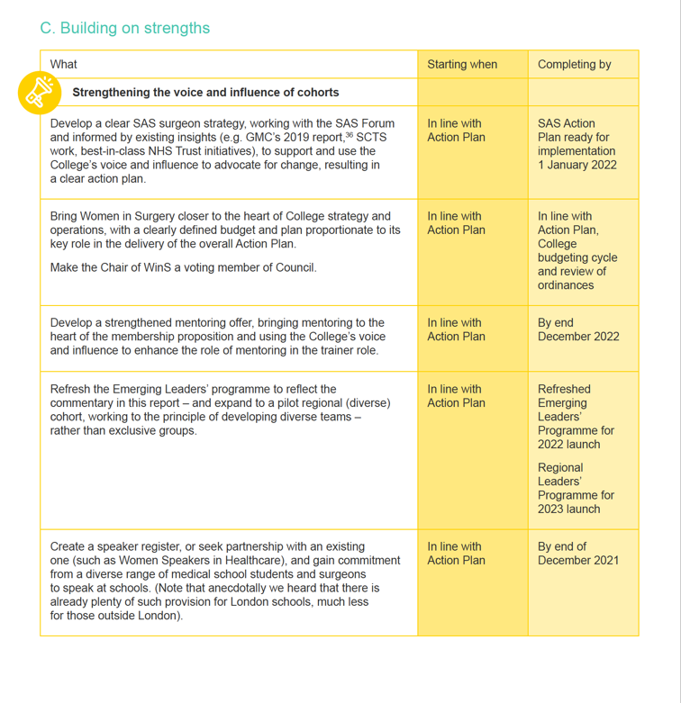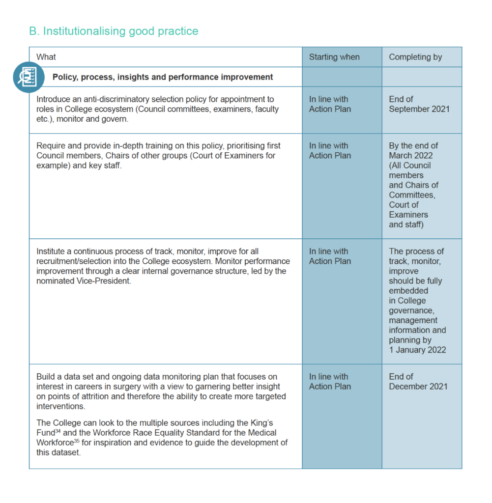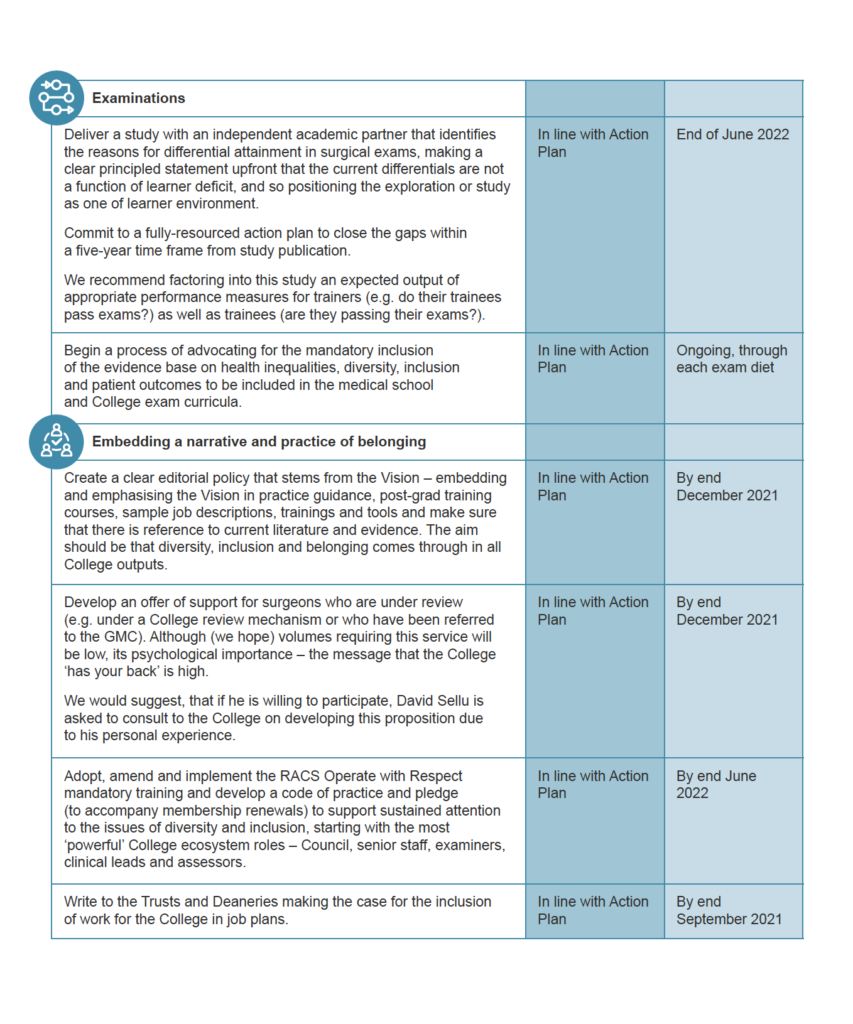 - Deliver a Study on Differential Attainment in Surgical Exams. Make a clear principled statement up front that the current differentials are NOT the function of learner deficit. This firmly locates any study in the learning environment. This work should be undertaken with an independent academic partner with a declared intention that any gaps should be closed within five years of publication of the study. It should be fully resourced and prioritised.