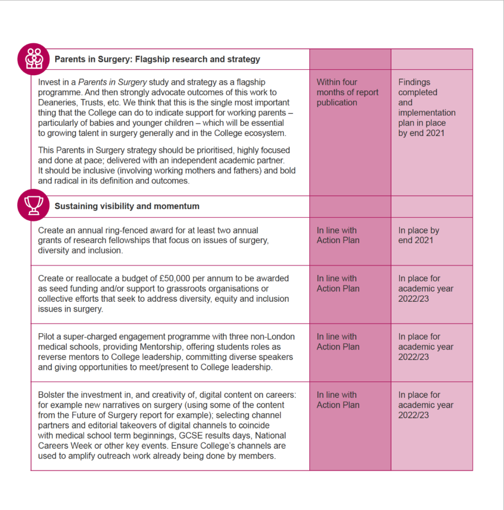 - FLAGSHIP PROJECT – Parents in Surgery. The experience of parents, who are training to be surgeons or are busy surgeons in practice, is extremely challenging and stressful; it demands urgent attention. A Task Force should be established to work with Deaneries, Trusts and Hospitals to address more supportive structures and career paths. The work of the Task Force should feed into the restructuring planned by government.